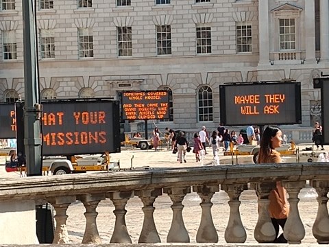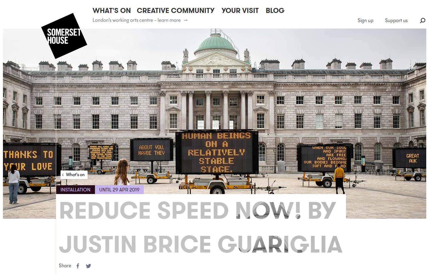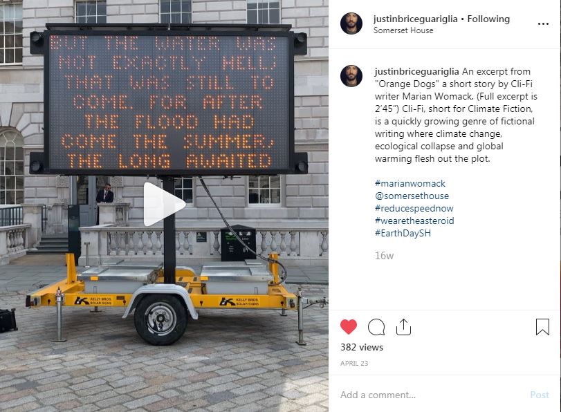I have always been very interested in the intersections between writing and other art forms, and therefore was really happy when Justin Brice Guariglia contacted me to be part of his new installation in Somerset House, Reduce Speed Now!. It features quotes and fragments from a bunch of really awesome people, like Timothy Norton, Zadie Smith, Greta Thunberg… and little old me! You can go and see it for free between the 16th and the 29th of April.