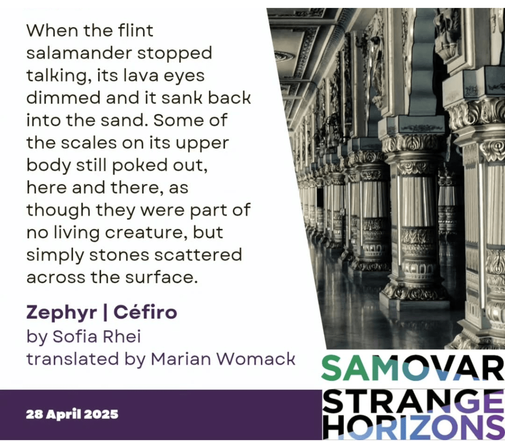 - Zephyr | Céfiro, by Sofia Rhei, translated by: Marian Womack, Samovar: A Quarterly Journal of Speculative Fiction in Translation. Eds. Sara Dodd, 2025.